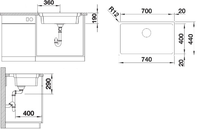 740 x 500 mm Medencemélység: 190 mm Alaptartozék: két rozsdamentes acél ETAGON sín, lefolyógarnitúra helytakarékos csővel, 3 ½“-os InFino® szűrőkosárral, húzógombos távműködtetővel |