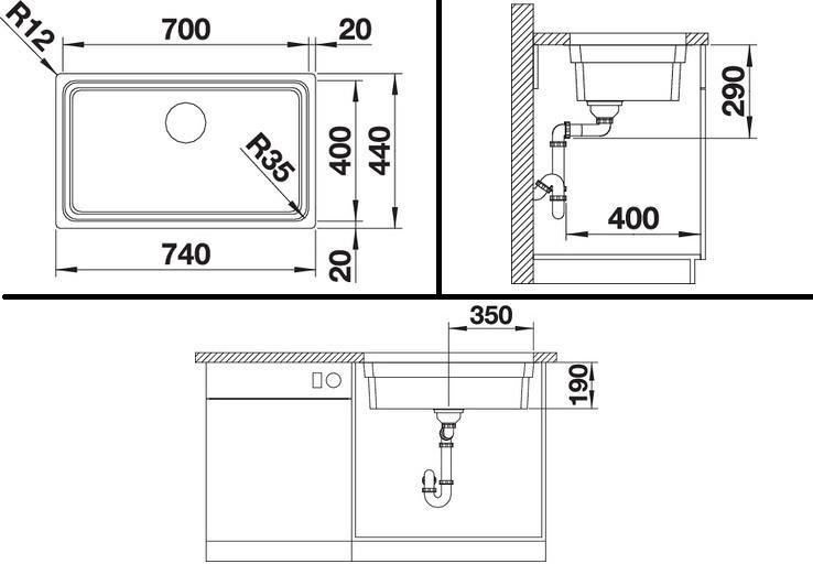 740 x 440 mm Medencemélység: 190 mm Alaptartozék: két rozsdamentes acél ETAGON sín, lefolyógarnitúra helytakarékos csővel, 3 ½“-os InFino® szűrőkosárral, húzógombos távműködtetővel |
